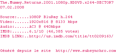 Voir le nfo de la release The.Mummy.Returns.2001.1080p.HDDVD.x264-SECTOR7