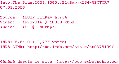 Voir le nfo de la release Into.The.Blue.2005.1080p.BluRay.x264-SECTOR7