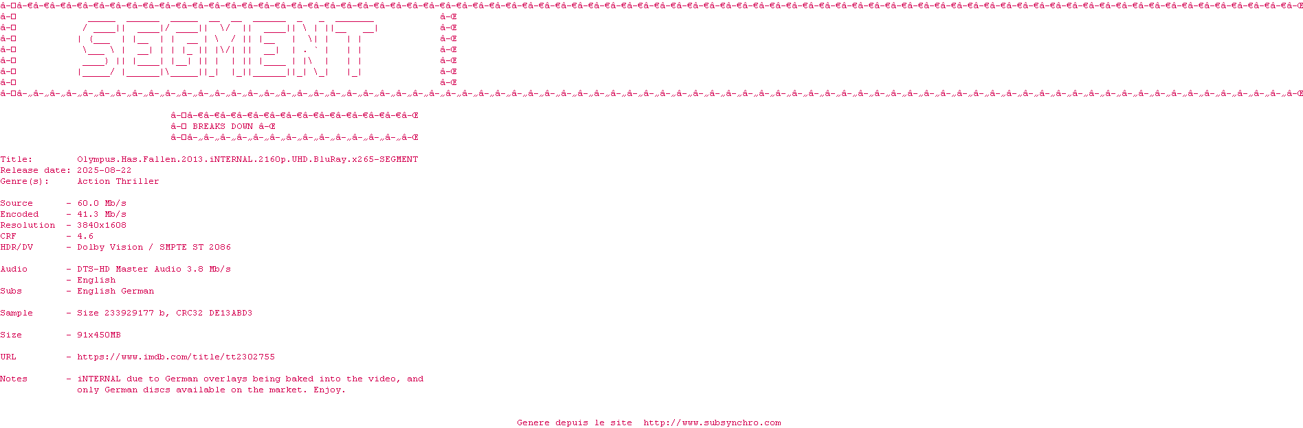 Voir le nfo de la release Olympus.Has.Fallen.2013.iNTERNAL.2160p.UHD.BluRay.x265-SEGMENT