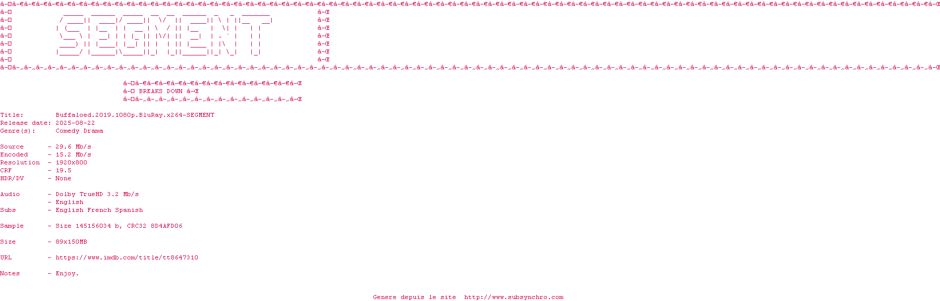 Voir le nfo de la release Buffaloed.2019.1080p.BluRay.x264-SEGMENT