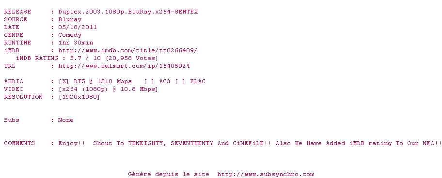 Voir le nfo de la release Duplex.2003.1080p.BluRay.x264-SEMTEX