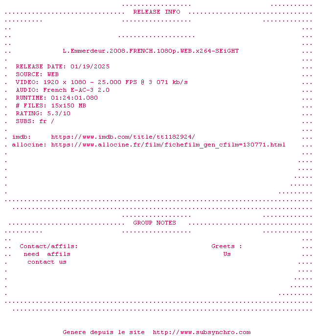 Voir le nfo de la release L.Emmerdeur.2008.FRENCH.1080p.WEB.x264-SEiGHT