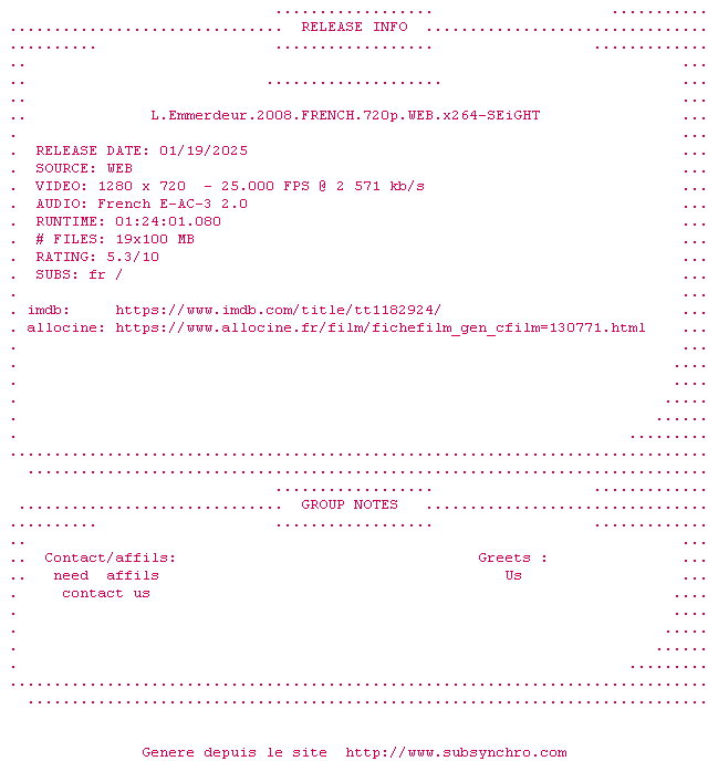 Voir le nfo de la release L.Emmerdeur.2008.FRENCH.720p.WEB.x264-SEiGHT