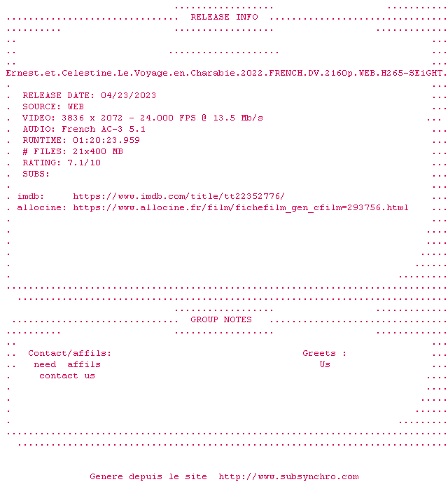 Voir le nfo de la release Ernest.Et.Celestine.Le.Voyage.En.Charabie.2022.FRENCH.HDR.2160p.WEB.H265-SEiGHT
