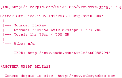 Voir le nfo de la release Better.Off.Dead.1985.iNTERNAL.BDRip.XviD-SHK
