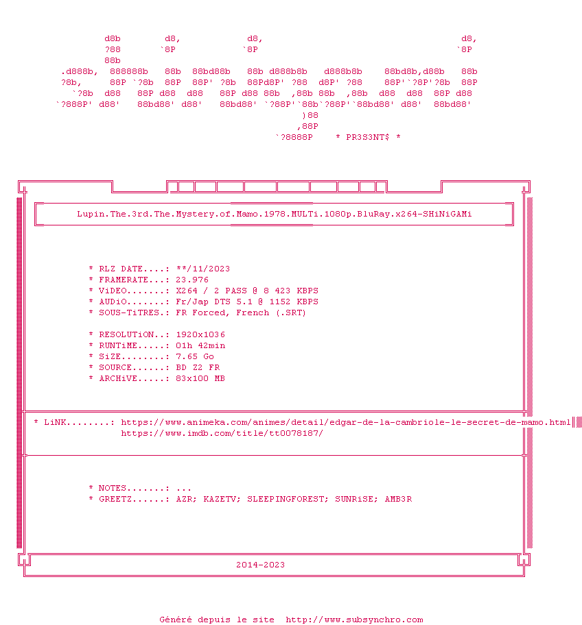 Voir le nfo de la release Lupin.The.3rd.The.Mystery.Of.Mamo.1978.MULTi.1080p.BluRay.x264-SHiNiGAMi