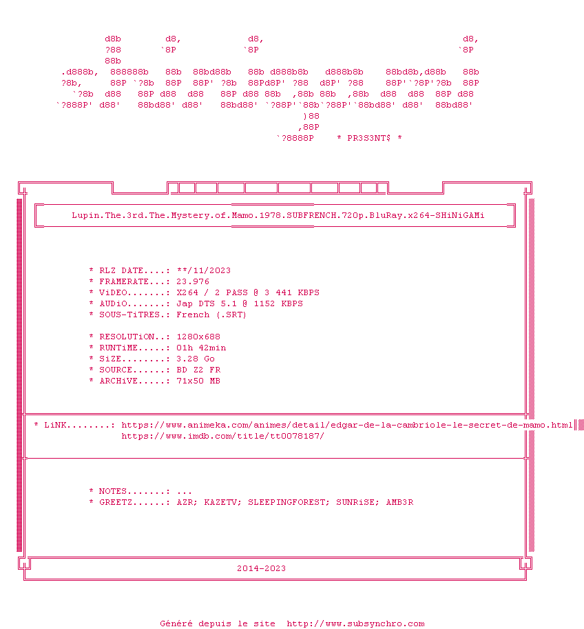 Voir le nfo de la release Lupin.The.3rd.The.Mystery.Of.Mamo.1978.SUBFRENCH.720p.BluRay.x264-SHiNiGAMi