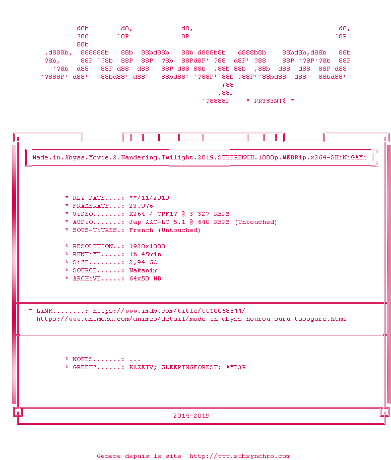 Voir le nfo de la release Made.In.Abyss.Movie.2.Wandering.Twilight.2019.SUBFRENCH.1080p.WEBRip.x264-SHiNiGAMi