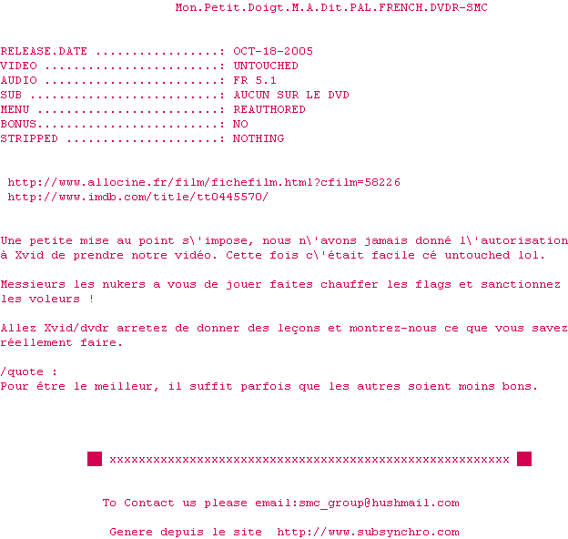 Voir le nfo de la release Mon.Petit.Doigt.M.A.Dit.PAL.FRENCH.DVDR.READNFO-SMC