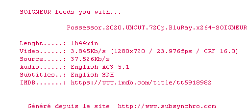 Voir le nfo de la release Possessor.2020.UNCUT.BDRip.x264-SOIGNEUR