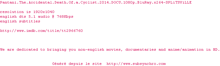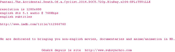 Voir le nfo de la release Pantani.The.Accidental.Death.Of.A.Cyclist.2014.DOCU.1080p.BluRay.x264-SPLiTSViLLE
