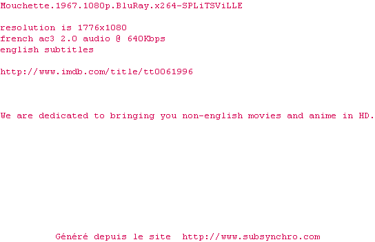 Voir le nfo de la release Mouchette.1967.1080p.BluRay.x264-SPLiTSViLLE