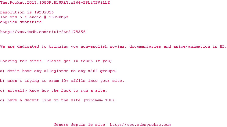 Voir le nfo de la release The.Rocket.2013.1080P.BLURAY.x264-SPLiTSViLLE
