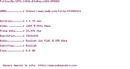 Voir le nfo de la release Follow.Me.1972.1080p.BluRay.x264-SPOOKS