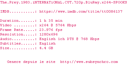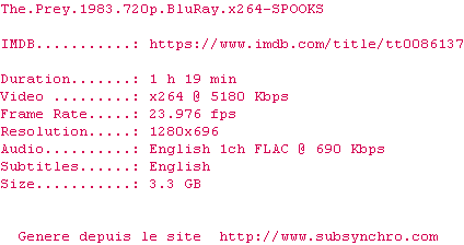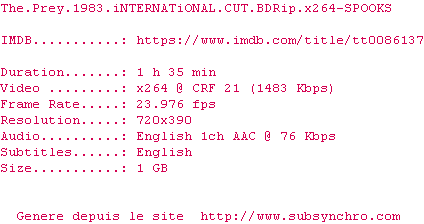 Voir le nfo de la release The.Prey.1983.INTERNATiONAL.CUT.720p.BluRay.x264-SPOOKS