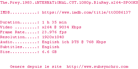Voir le nfo de la release The.Prey.1983.INTERNATiONAL.CUT.1080p.BluRay.x264-SPOOKS