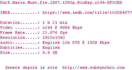 Voir le nfo de la release Surf.Nazis.Must.Die.1987.1080p.BluRay.x264-SPOOKS