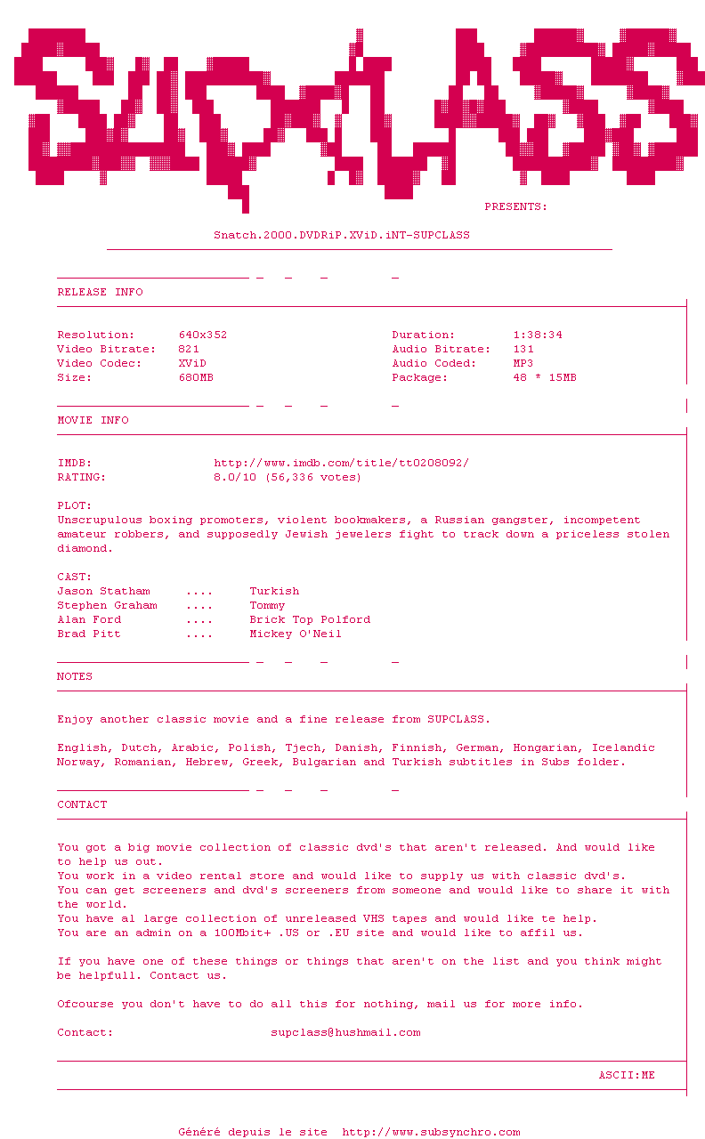Voir le nfo de la release Snatch.2000.DVDRiP.XViD.iNT-SUPCLASS