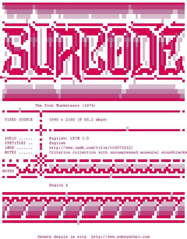 Voir le nfo de la release The.Four.Musketeers.1974.RA.COMPLETE.UHD.BLURAY-SURCODE