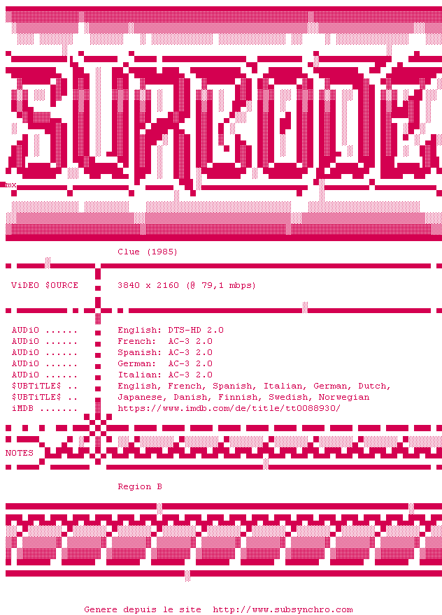 Voir le nfo de la release Clue.1985.COMPLETE.UHD.BLURAY-SURCODE