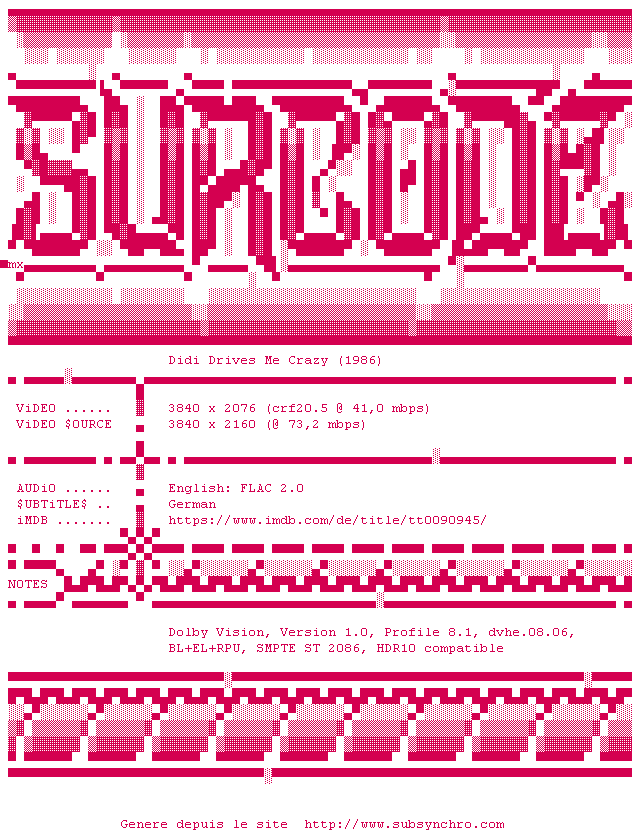 Voir le nfo de la release Didi.Drives.Me.Crazy.1986.DUBBED.2160p.UHD.BluRay.x265-SURCODE