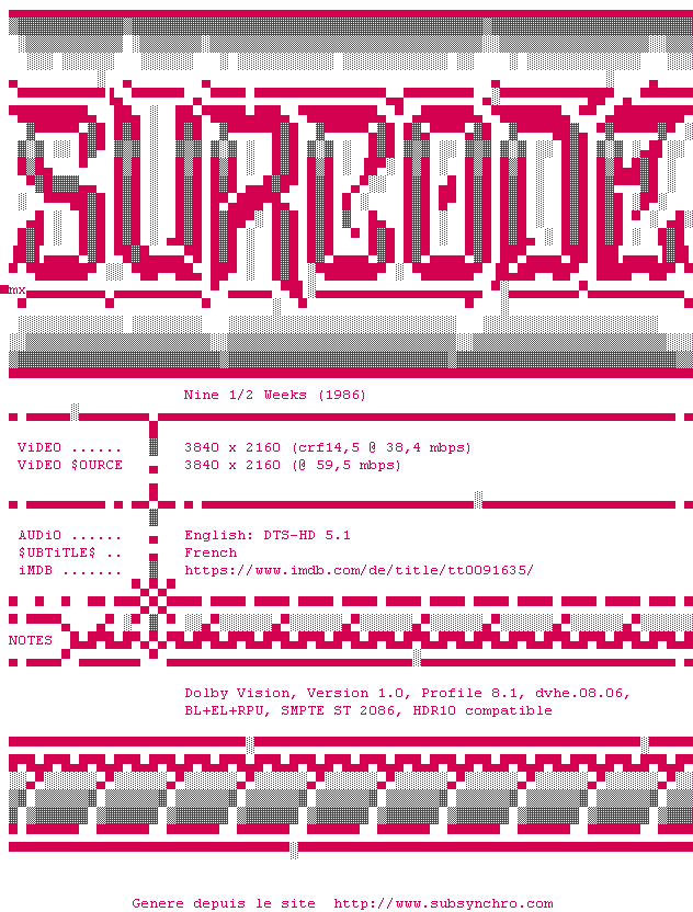 Voir le nfo de la release Nine.And.A.Half.Weeks.1986.2160p.UHD.BluRay.x265-SURCODE