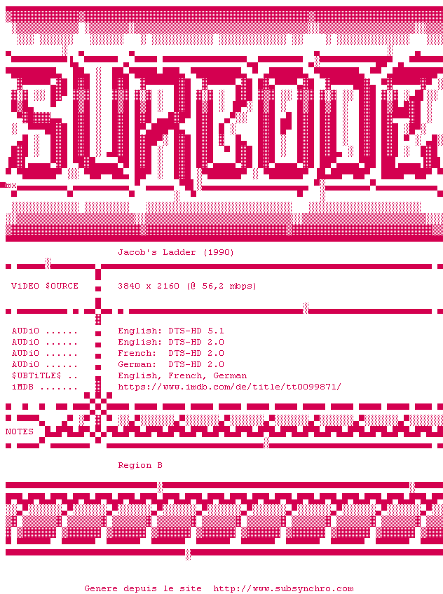 Voir le nfo de la release Jacobs.Ladder.1990.COMPLETE.UHD.BLURAY-SURCODE