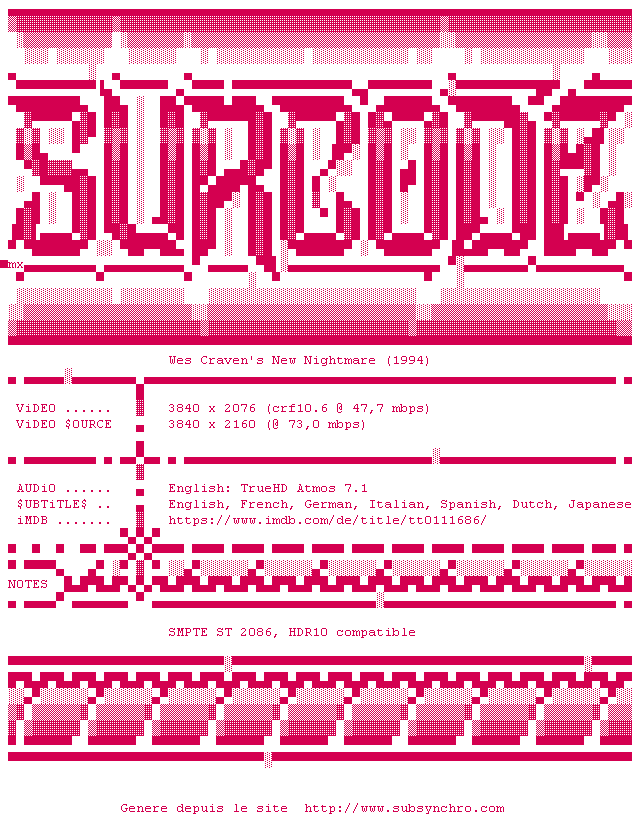 Voir le nfo de la release Freddys.Dead.The.Final.Nightmare.1991.READNFO.2160p.UHD.BluRay.x265-SURCODE