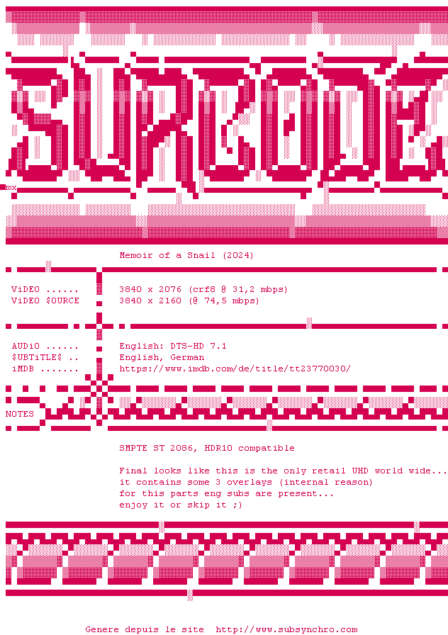 Voir le nfo de la release Memoir.Of.A.Snail.2024.iNTERNAL.2160p.UHD.BluRay.x265-SURCODE
