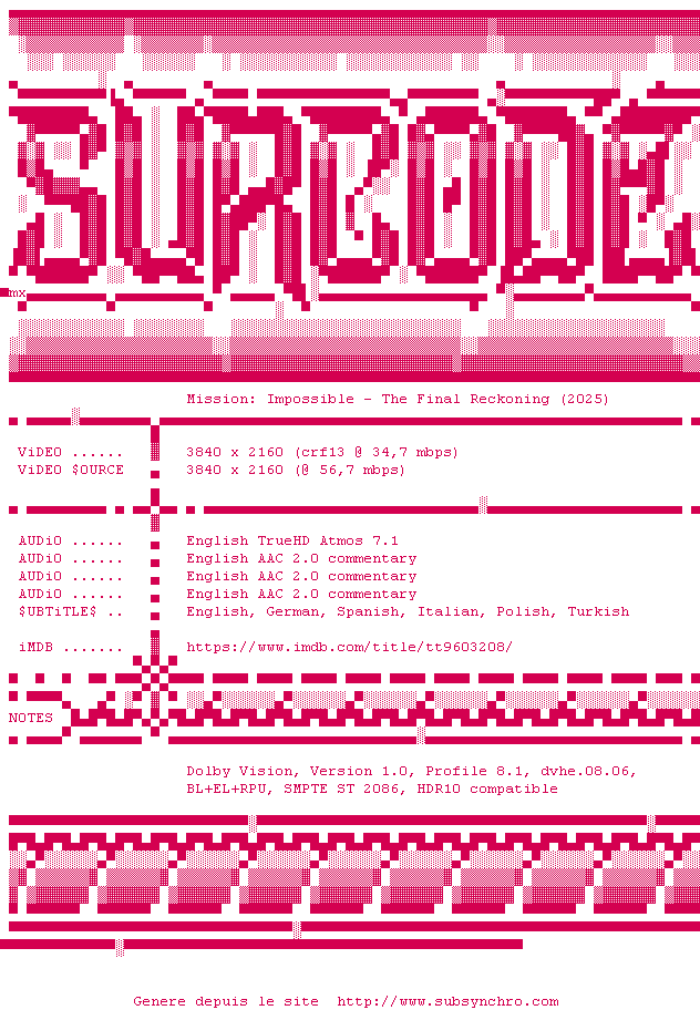 Voir le nfo de la release Mission.Impossible.The.Final.Reckoning.2025.2160p.UHD.BluRay.x265-SURCODE