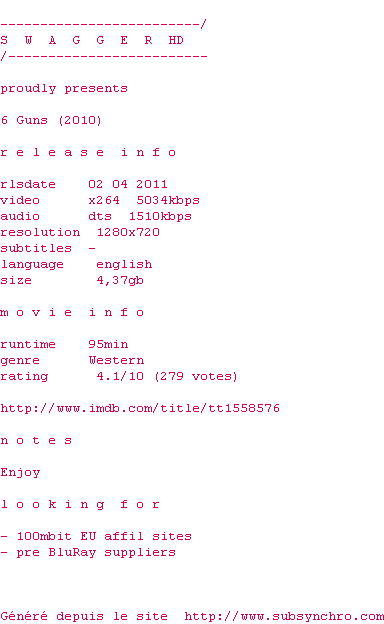 Voir le nfo de la release 6.Guns.2010.720p.BluRay.x264-SWAGGERHD