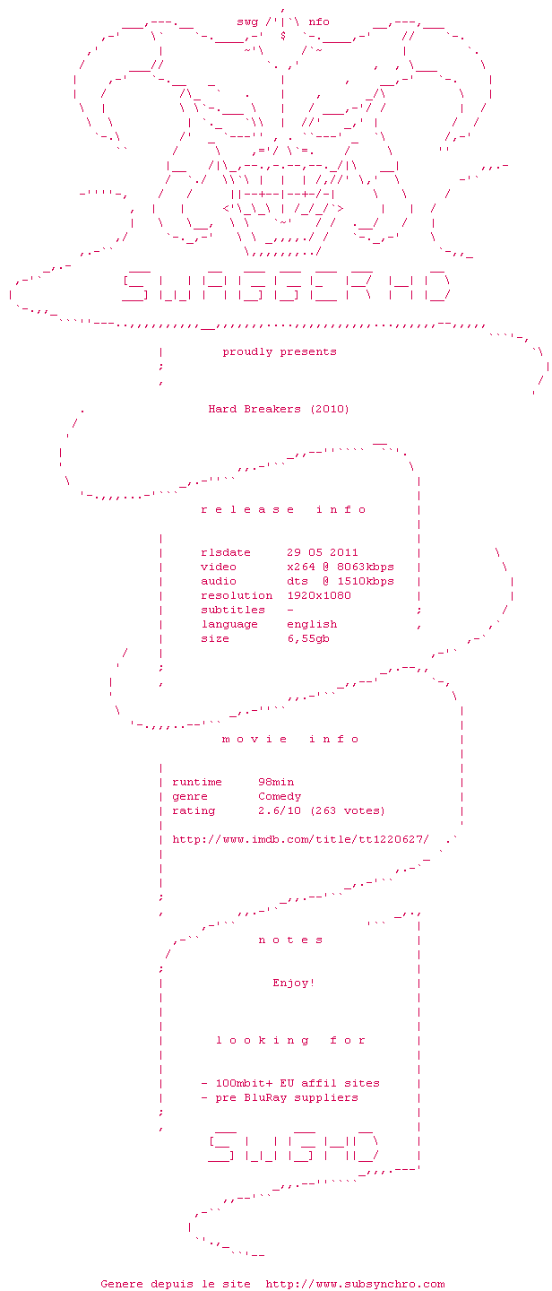 Voir le nfo de la release Hard.Breakers.2010.1080p.BluRay.x264-SWAGGERHD