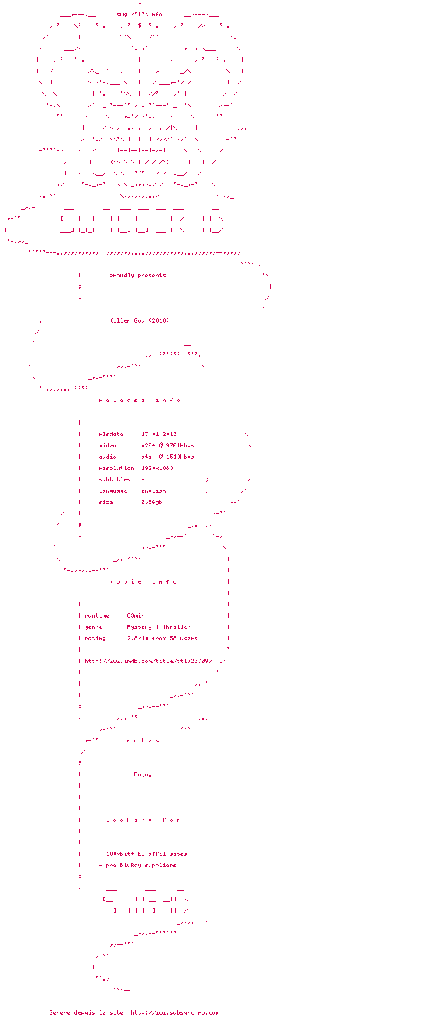 Voir le nfo de la release Killer.God.2010.1080p.BluRay.x264-SWAGGERHD