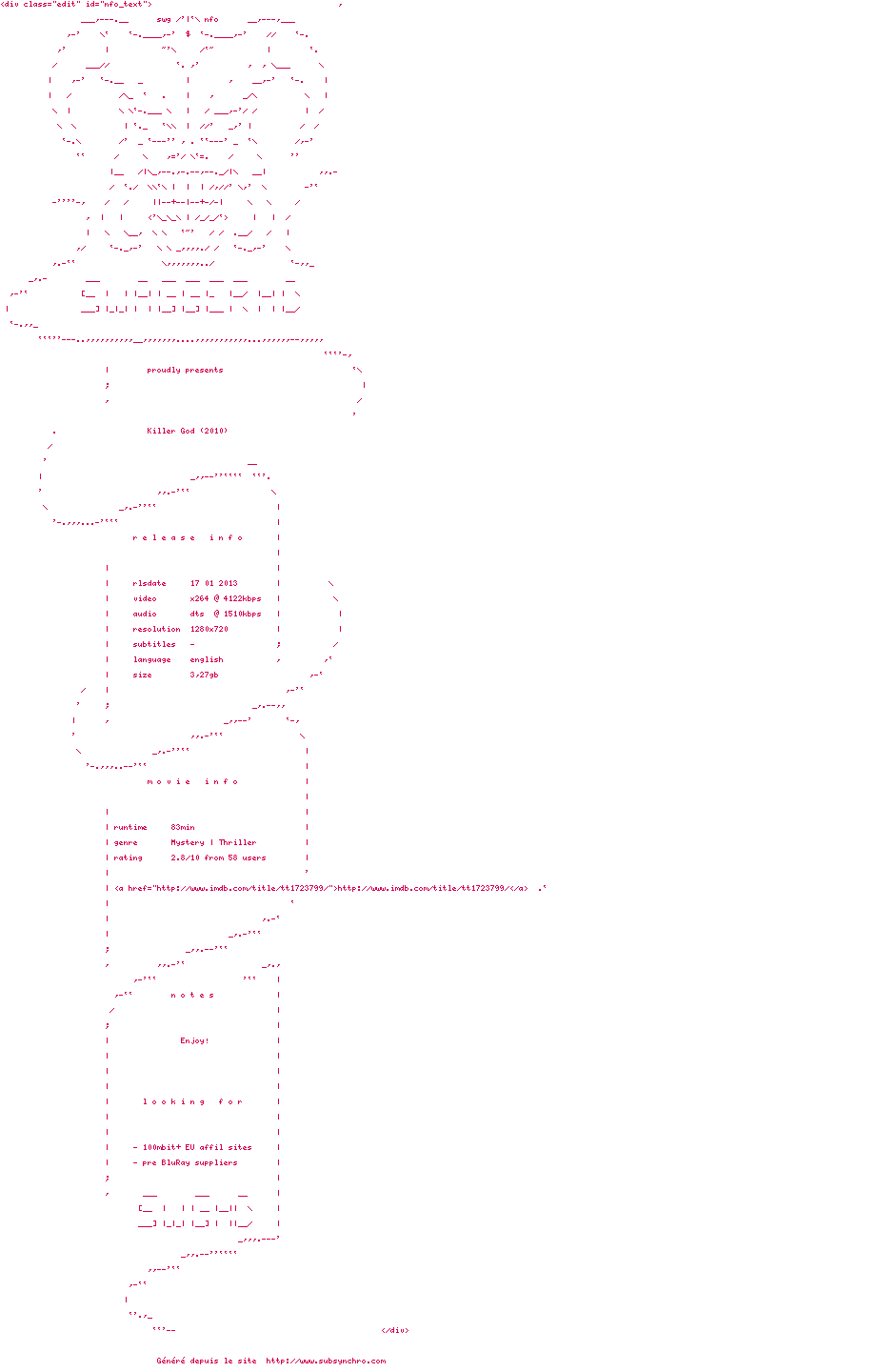 Voir le nfo de la release Killer.God.2010.720p.BluRay.x264-SWAGGERHD