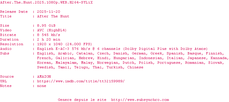 Voir le nfo de la release After.The.Hunt.2025.1080p.WEB.H264-SYLiX