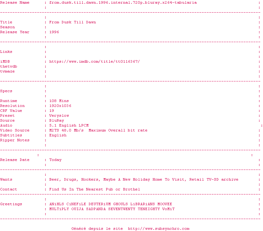 Voir le nfo de la release From.Dusk.Till.Dawn.1996.iNTERNAL.720p.BluRay.x264-TABULARiA
