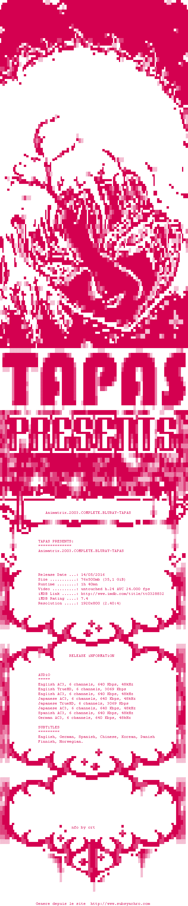 Voir le nfo de la release The.Animatrix.2003.COMPLETE.BLURAY-TAPAS