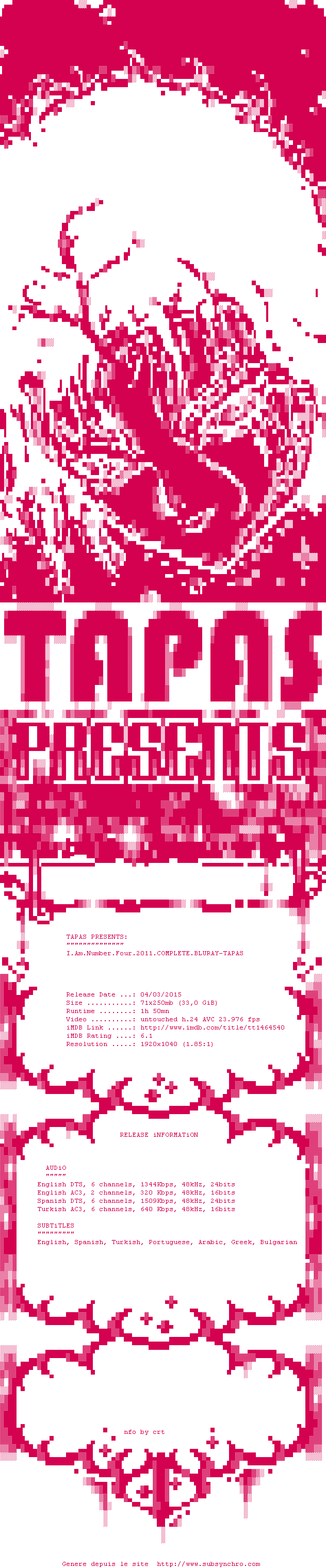 Voir le nfo de la release I.Am.Number.Four.2011.COMPLETE.BLURAY-TAPAS