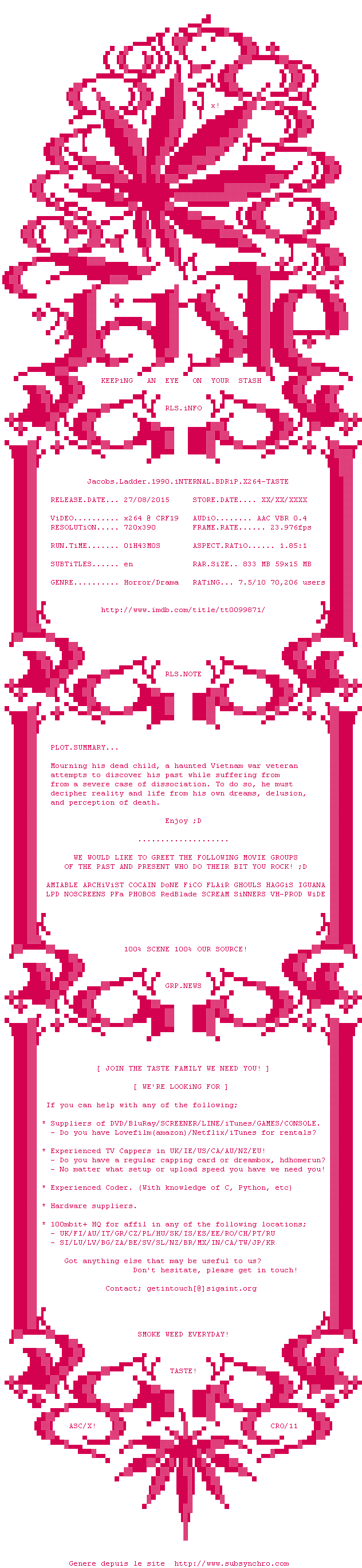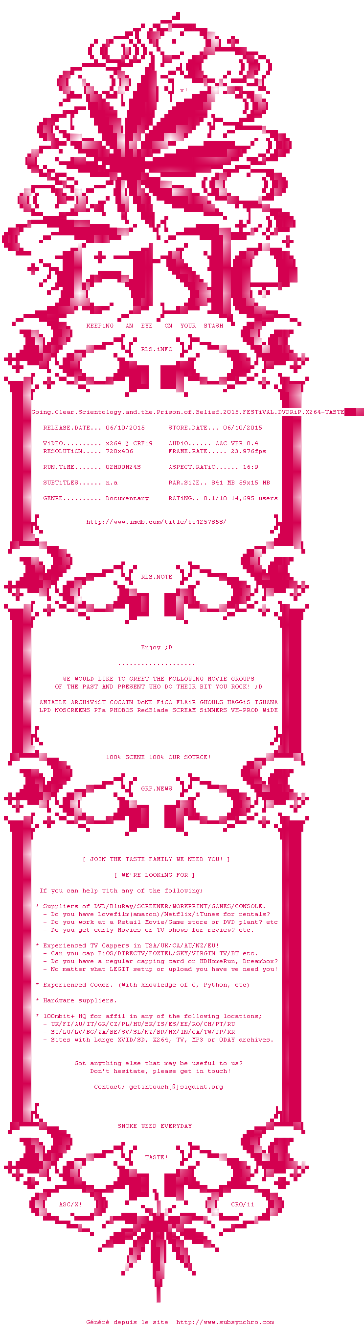 Voir le nfo de la release Going.Clear.Scientology.And.The.Prison.Of.Belief.2015.FESTiVAL.DVDRiP.x264-TASTE