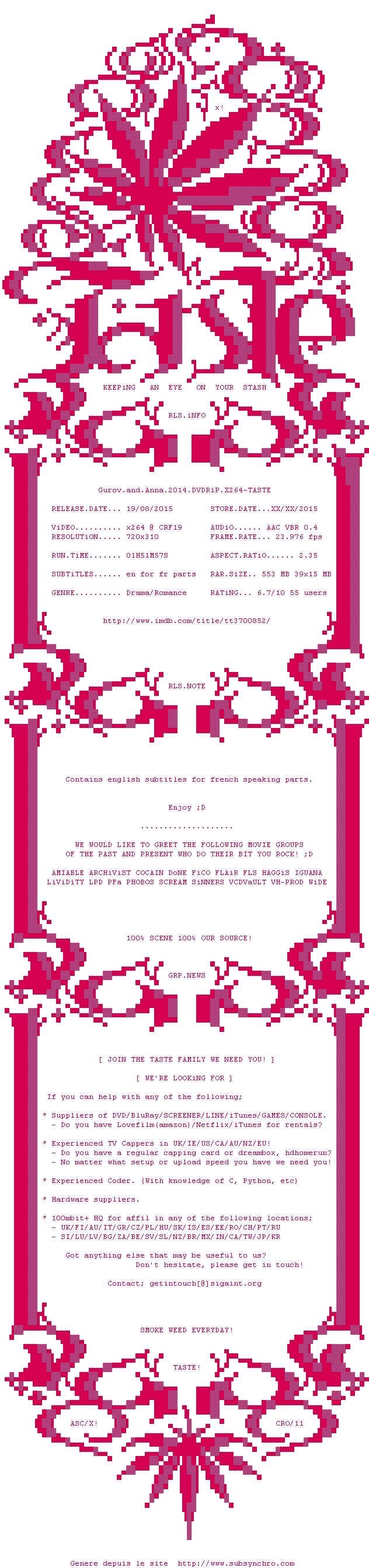 Voir le nfo de la release Are.You.Here.2013.BDRiP.X264-TASTE