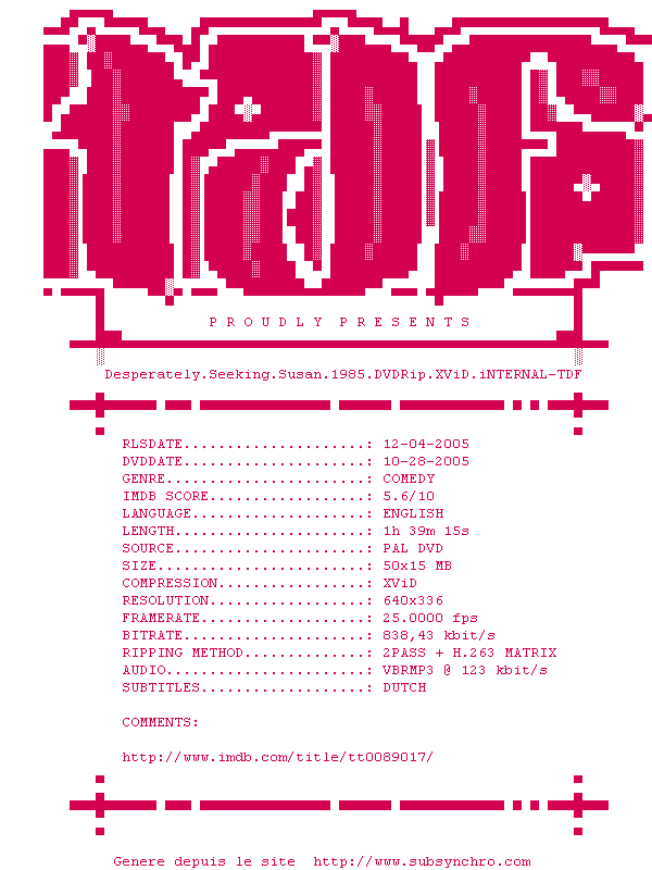Voir le nfo de la release Unforgettable.1996.iNTERNAL.AC3.DVDRip.XviD-TDF