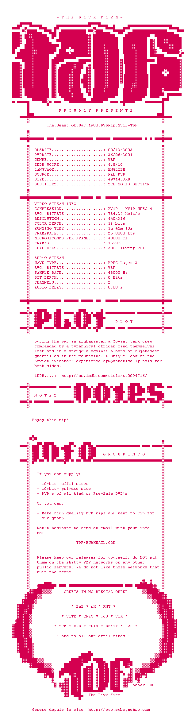 Voir le nfo de la release Platoon.1986.iNTERNAL.DVDRiP.XviD.AC3-TDF