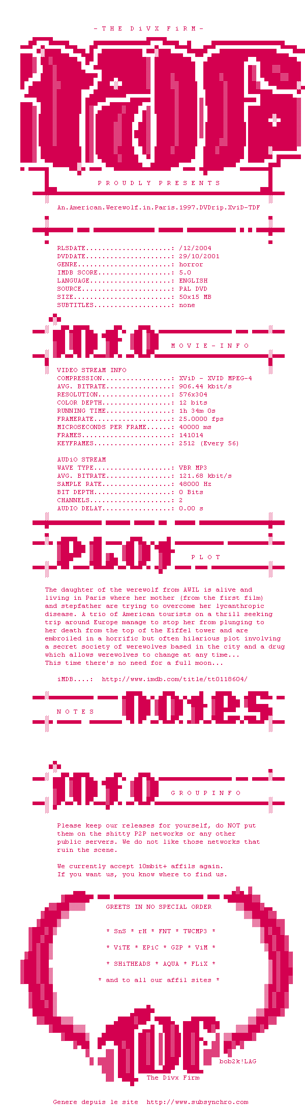 Voir le nfo de la release Magnolia.1999.INTERNAL.DVDRip.XviD-TDF