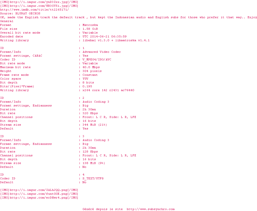Voir le nfo de la release The.Raid.2.2014.BRRIP.x264.AC3-TiTAN
