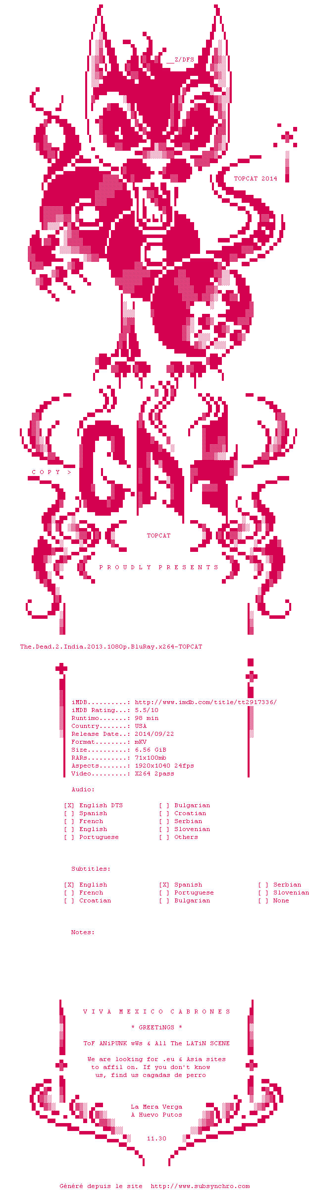 Voir le nfo de la release The.Dead.2.India.2013.1080p.BluRay.x264-TOPCAT