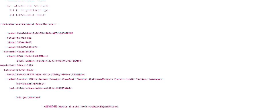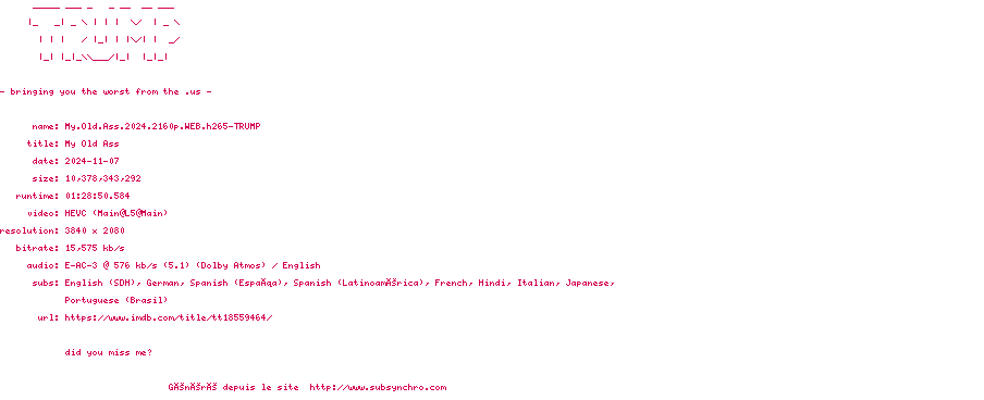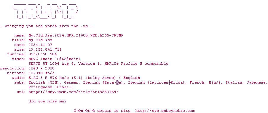 Voir le nfo de la release My.Old.Ass.2024.HDR.2160p.WEB.H265-TRUMP
