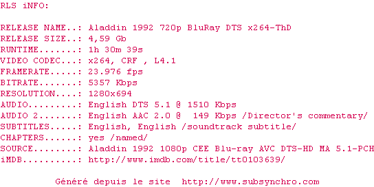 Voir le nfo de la release Aladdin.1992.720p.BluRay.DTS.x264-ThD