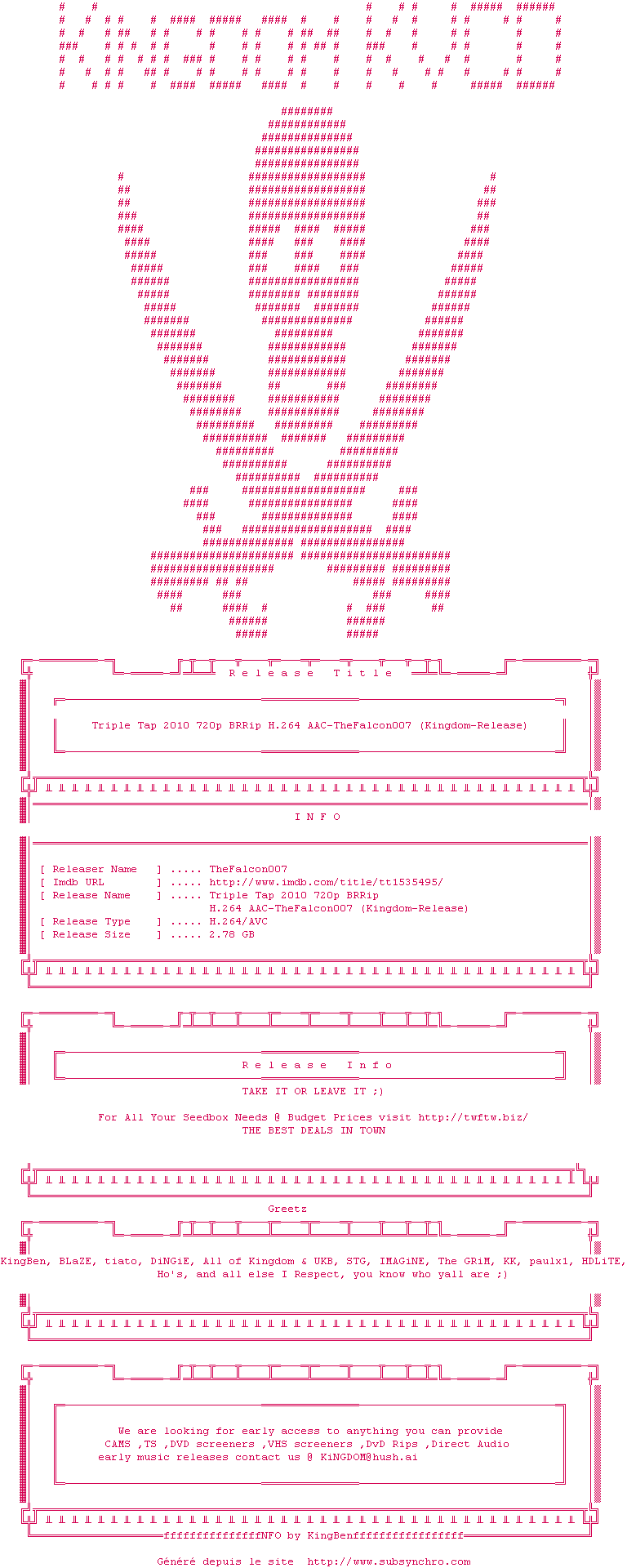 Voir le nfo de la release Triple.Tap.2010.720p.BRRip.H.264.AAC-TheFalcon007