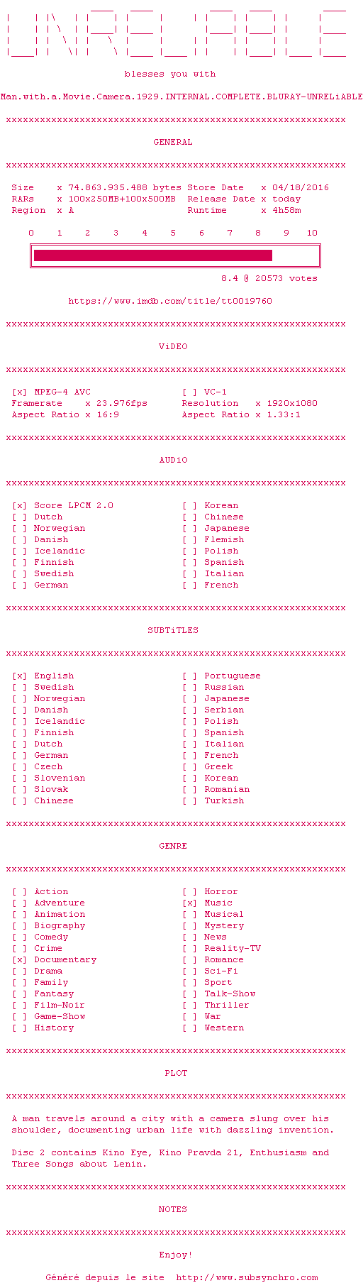 Voir le nfo de la release Man.With.A.Movie.Camera.1929.iNTERNAL.COMPLETE.BLURAY-UNRELiABLE