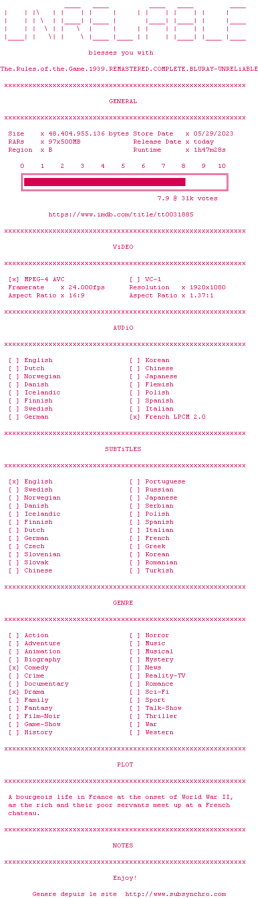 Voir le nfo de la release The.Rules.Of.The.Game.1939.REMASTERED.COMPLETE.BLURAY-UNRELiABLE